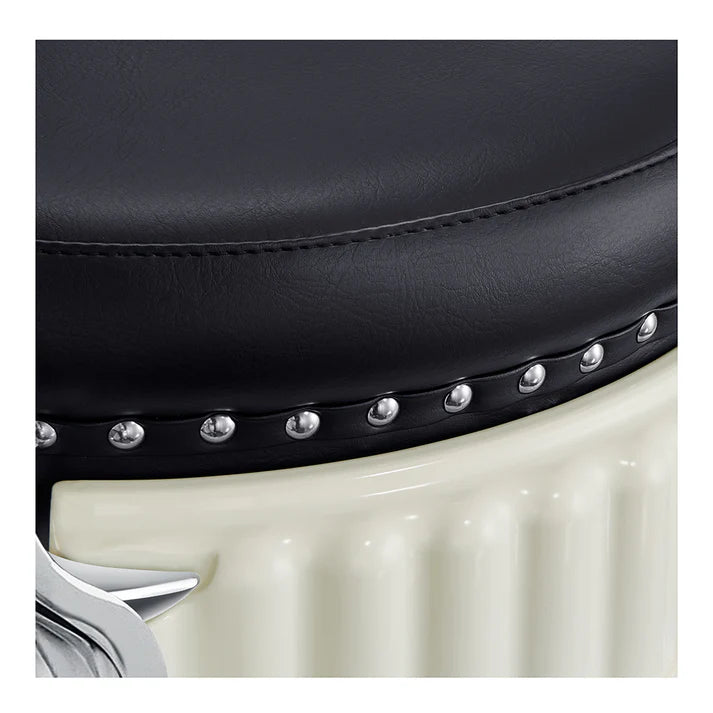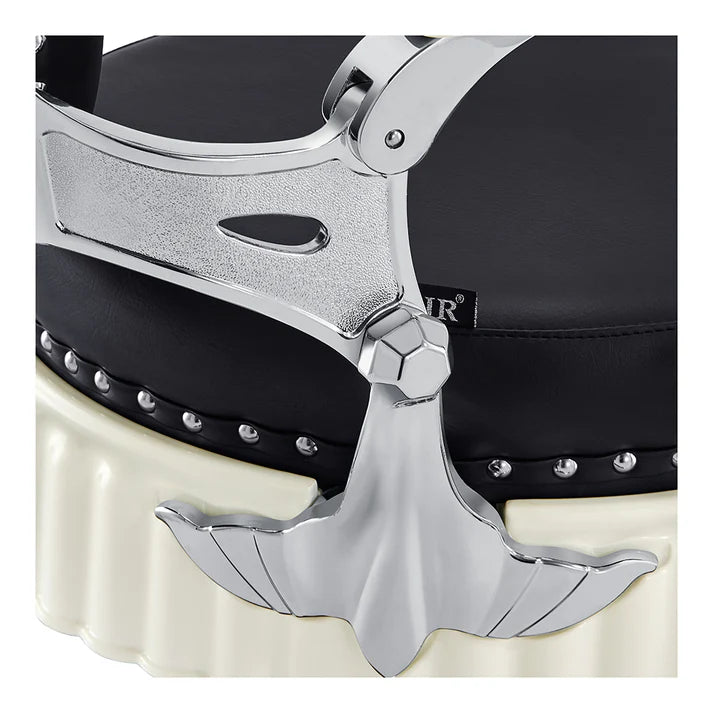 Introducing the DIR Mikado Vintage Barber Chair: The perfect blend of European modern design and classic barbershop tradition. Features a sturdy, antique-detailed chrome frame, luxurious faux leather, and a reclining back with a padded flip-up footrest—the ultimate comfort and style upgrade for your business.