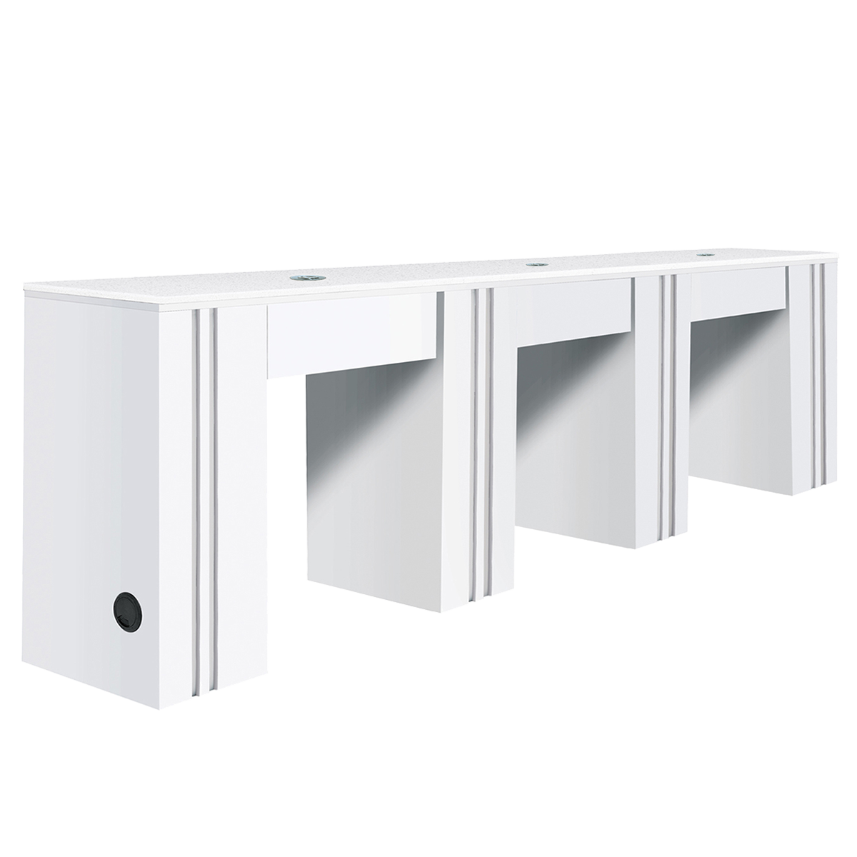 NM 906T Triple Manicure Nail Table offers three workstations while having a custom look as well as saving space at only 104 inches in length. The smooth, beautiful, and durable corian top surface has plenty of room for your technicians to work. Several openings in the top and sides to allow you to place power cords and other equipment where they are most convenient. Solid construction and sturdy materials mean that this table will stand up to many hours of use. Available in Black, Gray or White.
