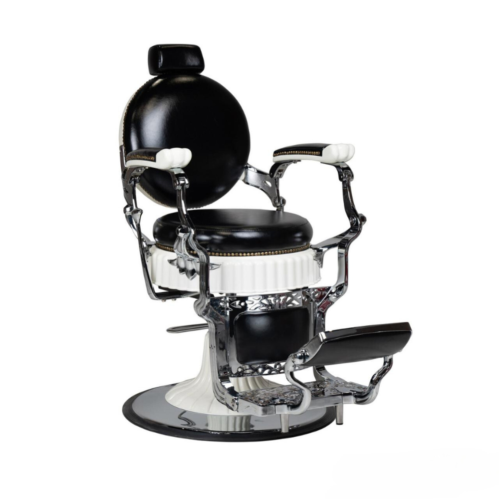The sleek and modern Franklin Barber Chair showcases a pristine white trim, adding a touch of sophistication to its overall aesthetic. Featuring stylish rivets, this chair not only enhances its visual appeal but also conveys a sense of craftsmanship. The combination of crisp white detailing and leather rivets creates a modern yet classic ambiance, providing both comfort and style for an elevated grooming experience in any barbershop setting. Available in four colors.