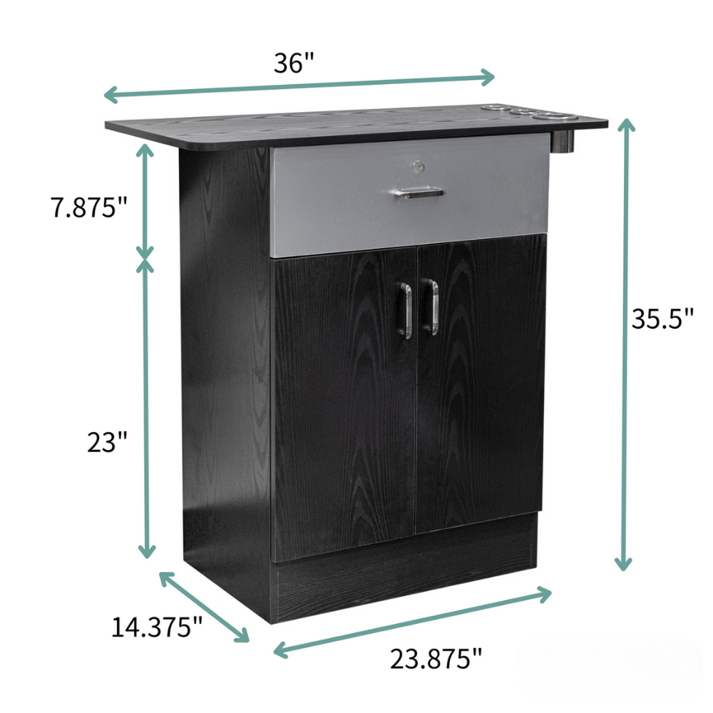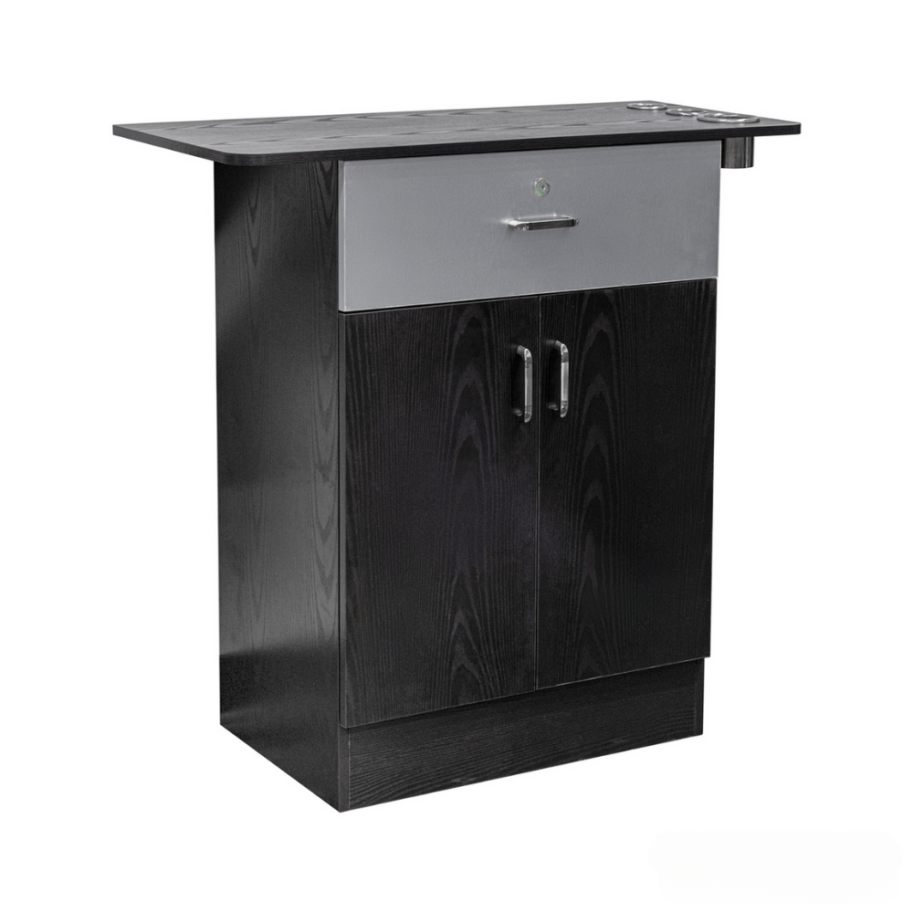 Experience the ultimate convenience with the "Chloe" styling station, perfect for placement underneath your mirror. Boasting a lockable drawer, double door cabinet, and 3 appliance holders, it offers ample space for all your hairstyling needs. Its heat resistant appliance holders ensure long-lasting durability, making it a must-have for any salon stylist.